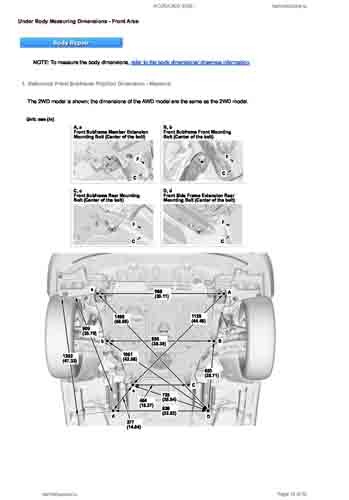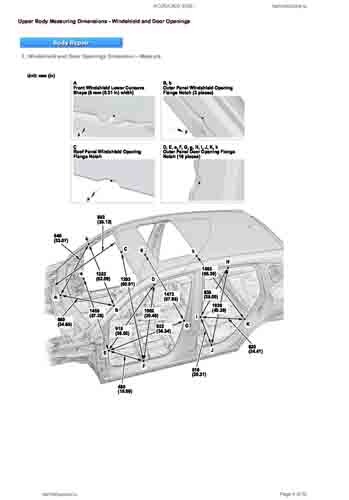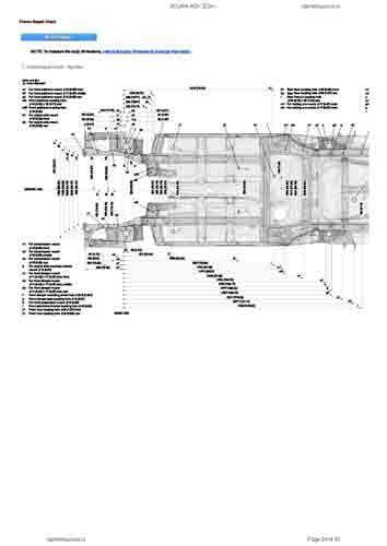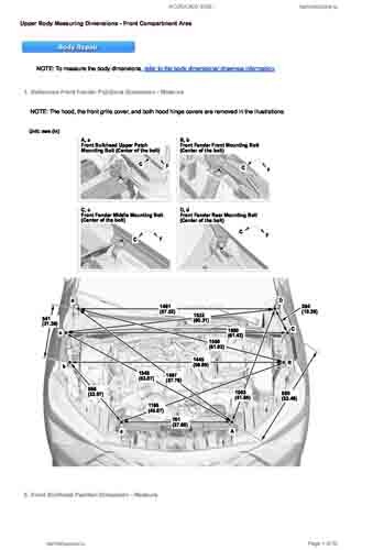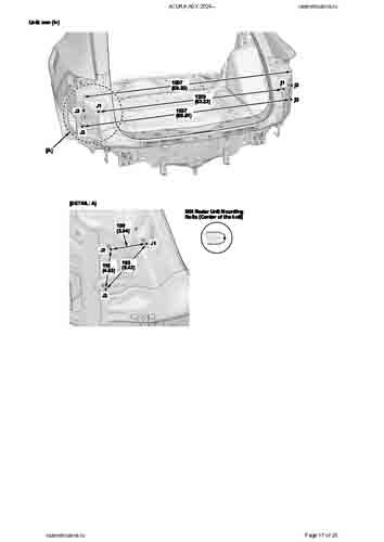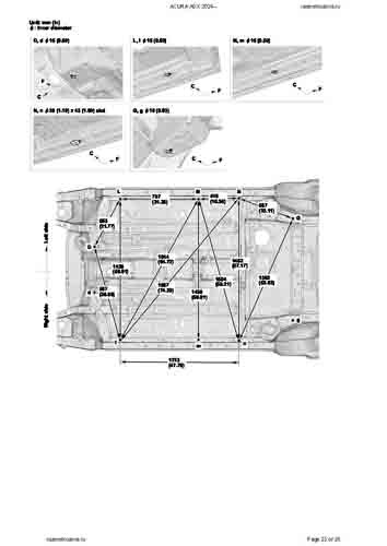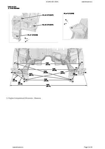 Контрольные кузовные размеры ACURA ADX 2024-- из официального руководства по ремонту кузова. Содержат размеры верхней и нижней части кузова, в том числе размеры моторного отсека, диагональные размеры проемов кузова, размеры подрамников и контрольные точки для восстановления геометрии кузова. Даны значения допустимых зазоров кузовных панелей.