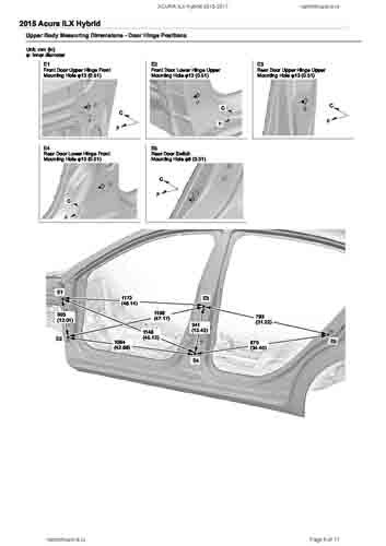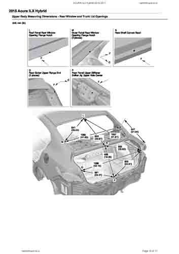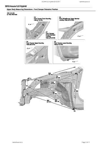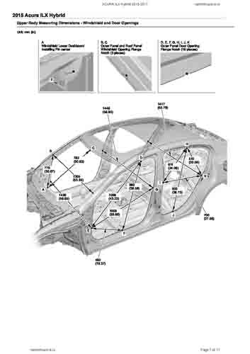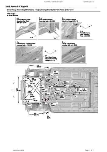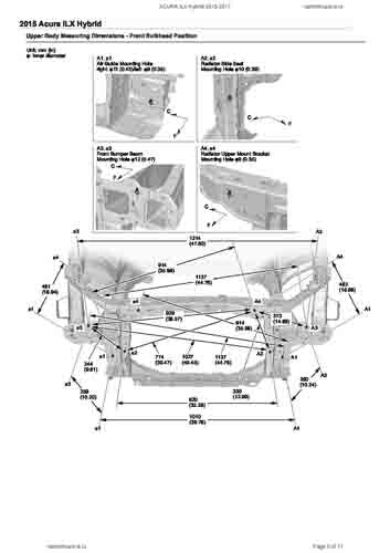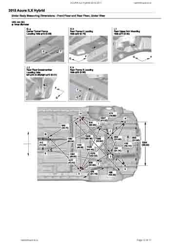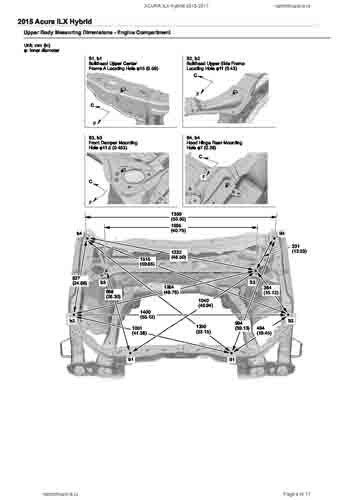 Контрольные кузовные размеры ACURA ILX Hybrid 2013-2017 из официального руководства по ремонту кузова. Содержат размеры верхней и нижней части кузова, в том числе размеры моторного отсека, диагональные размеры проемов кузова, размеры подрамников и контрольные точки для восстановления геометрии кузова. Даны значения допустимых зазоров кузовных панелей.
