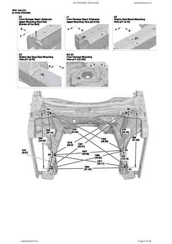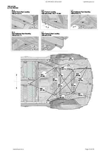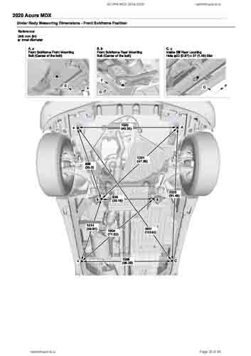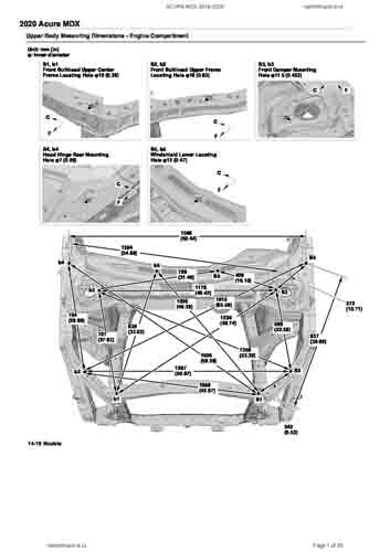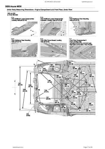 Контрольные кузовные размеры ACURA MDX 2013–2016-2020 из официального руководства по ремонту кузова. Содержат размеры верхней и нижней части кузова, в том числе размеры моторного отсека, диагональные размеры проемов кузова, размеры подрамников и контрольные точки для восстановления геометрии кузова. Даны значения допустимых зазоров кузовных панелей.
