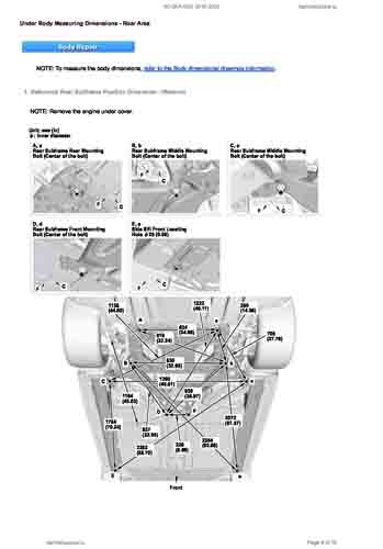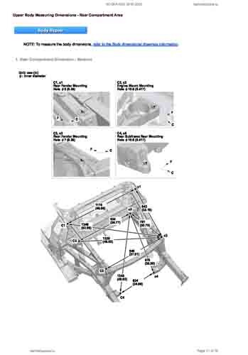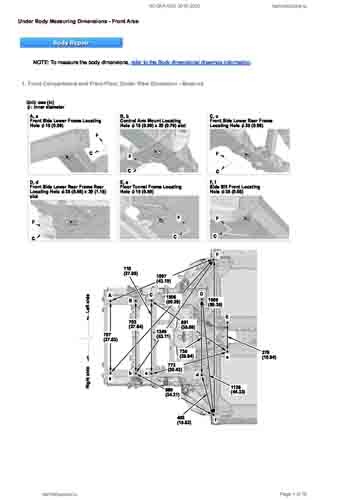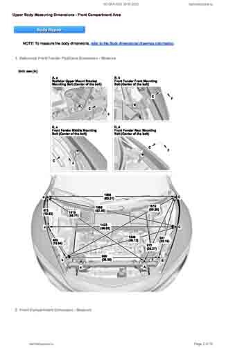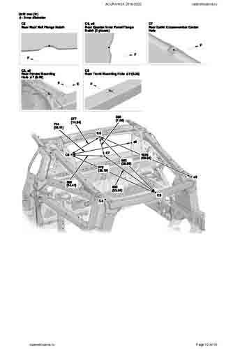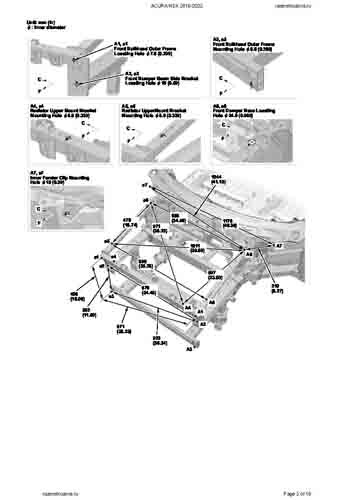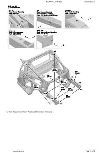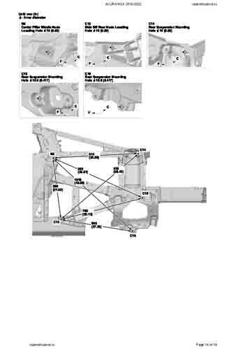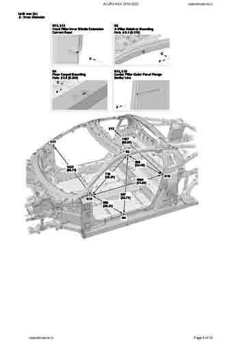 Контрольные кузовные размеры ACURA NSX 2016-2022 из официального руководства по ремонту кузова. Содержат размеры верхней и нижней части кузова, в том числе размеры моторного отсека, диагональные размеры проемов кузова, размеры подрамников и контрольные точки для восстановления геометрии кузова. Даны значения допустимых зазоров кузовных панелей.