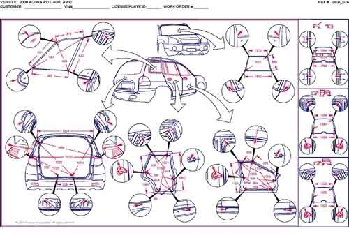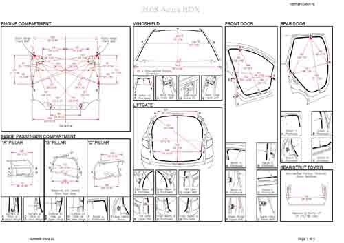 - Геометрические размеры кузова ACURA RDX 2007-2009-2012, как проекционные, так и непосредственного измерения, в том числе диагональные размеры проемов кузова и контрольные точки для восстановления геометрии Акура RDX.