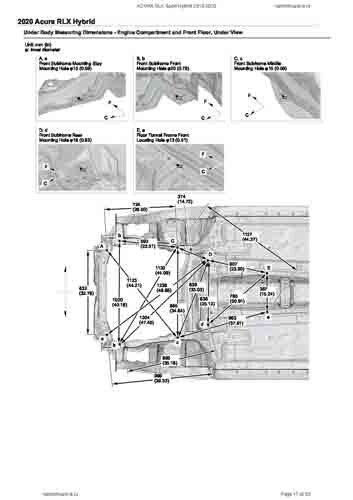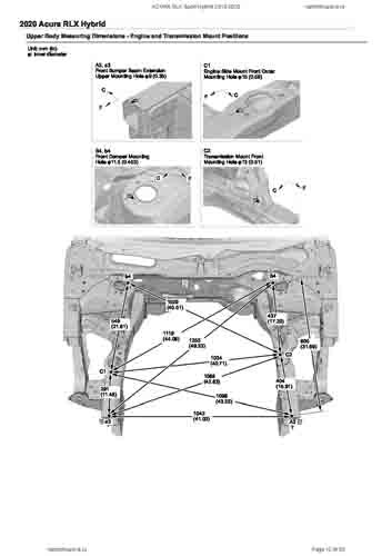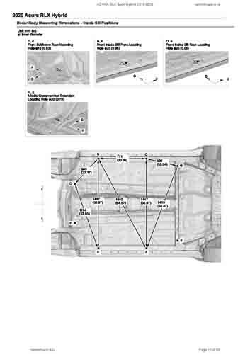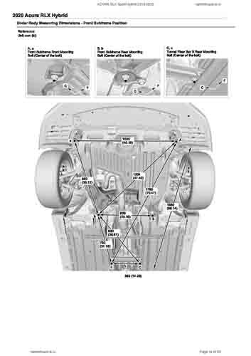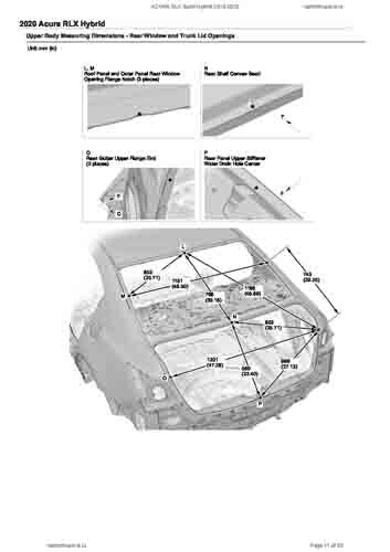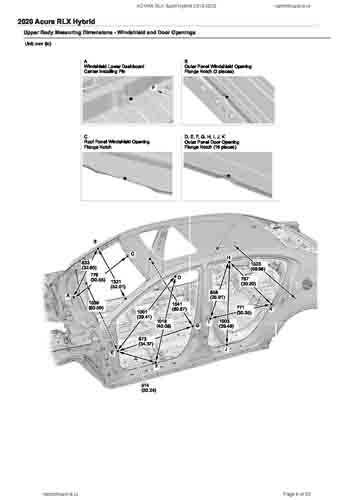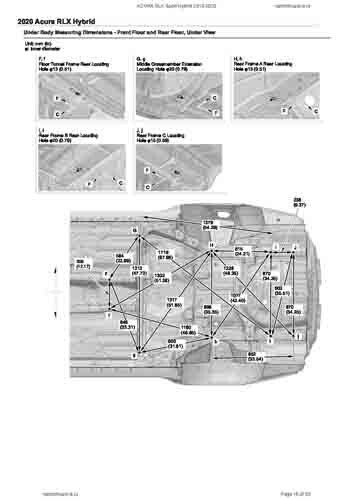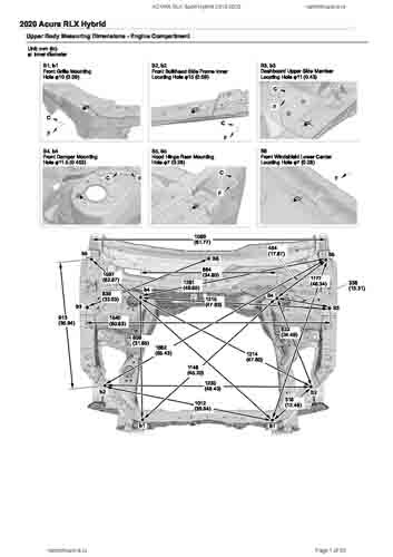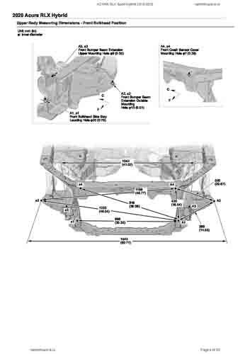 Контрольные кузовные размеры ACURA RLX Sport Hybrid 2014-2020 из официального руководства по ремонту кузова. Содержат размеры верхней и нижней части кузова, в том числе размеры моторного отсека, диагональные размеры проемов кузова, размеры подрамников и контрольные точки для восстановления геометрии кузова. Даны значения допустимых зазоров кузовных панелей.