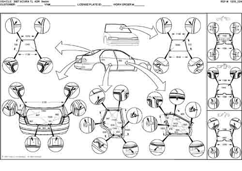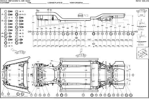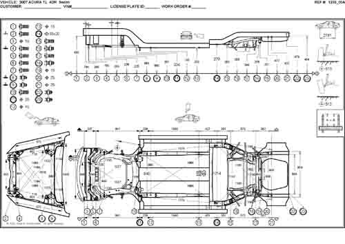 - Геометрические размеры кузова ACURA TL 2003-2006-2008, как проекционные, так и непосредственного измерения, в том числе диагональные размеры проемов кузова и контрольные точки для восстановления геометрии кузова.
