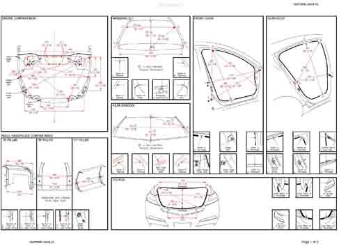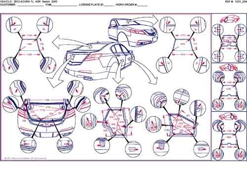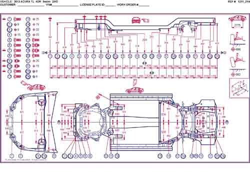 - Геометрические размеры кузова ACURA TL 2009-2014, как проекционные, так и непосредственного измерения, в том числе диагональные размеры проемов кузова и контрольные точки для восстановления геометрии кузова Акура TL.