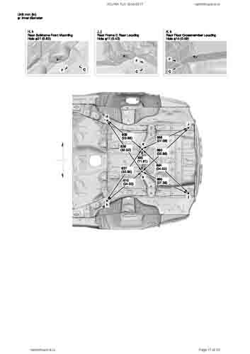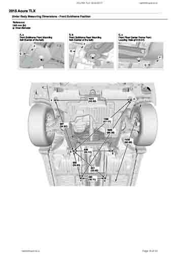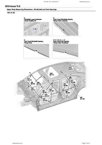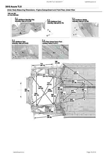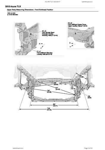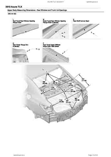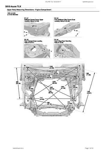 Контрольные кузовные размеры ACURA TLX 2014-2017–2020из официального руководства по ремонту кузова. Содержат размеры верхней и нижней части кузова, в том числе размеры моторного отсека, диагональные размеры проемов кузова, размеры подрамников и контрольные точки для восстановления геометрии кузова. Даны значения допустимых зазоров кузовных панелей.