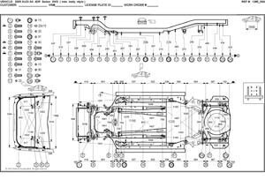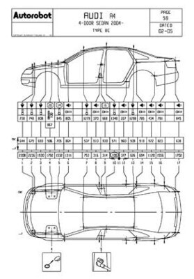 - Геометрические размеры кузова, как проекционные, так и непосредственного измерения, в том числе диагональные размеры проемов кузова и контрольные точки для восстановления геометрии кузова AUDI A4 2004-2007.