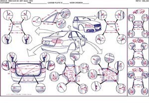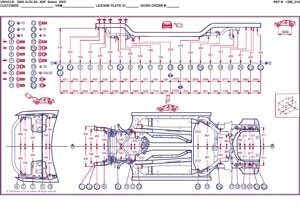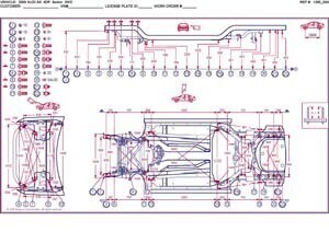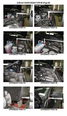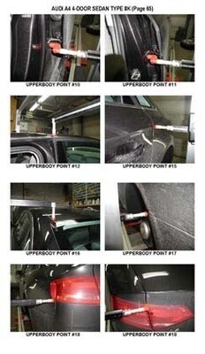 -Проекционные геометрические размеры кузова AUDI A4 (B8 8K) 2008-2015 с привязкой к стапелю. Дополнительно приведены цветные фотографии мест расположения контрольных точек на реальном автомобиле.