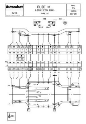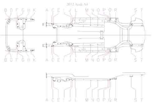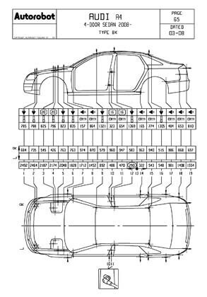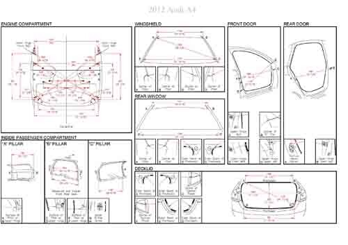 - Геометрические размеры AUDI A4 (B8 8K) 2008-2015, как проекционные, так и непосредственного измерения, в том числе диагональные размеры проемов кузова и контрольные точки для восстановления геометрии кузова..