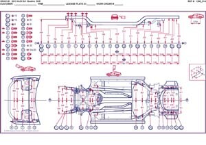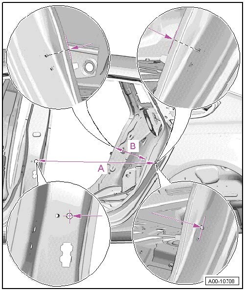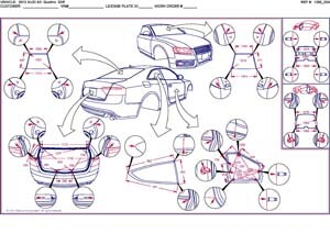 - Геометрические размеры кузова для автомобилей AUDI A5, как проекционные, так и непосредственного измерения, в том числе диагональные размеры проемов и контрольные точки для восстановления геометрии кузова.