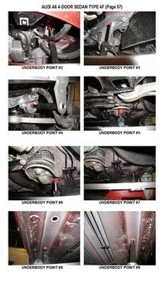 - Проекционные геометрические размеры кузова АУДИ А6 с привязкой к стапелю. Дополнительно приведены цветные фотографии мест расположения контрольных точек AUDI A6 на реальном автомобиле.