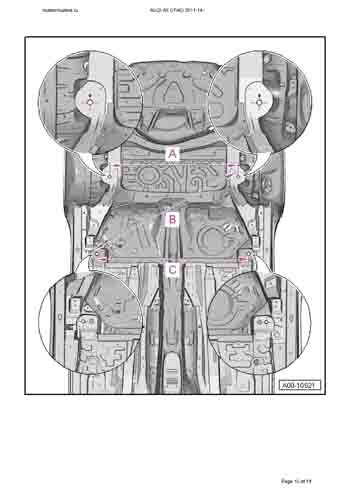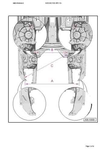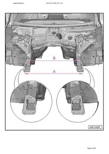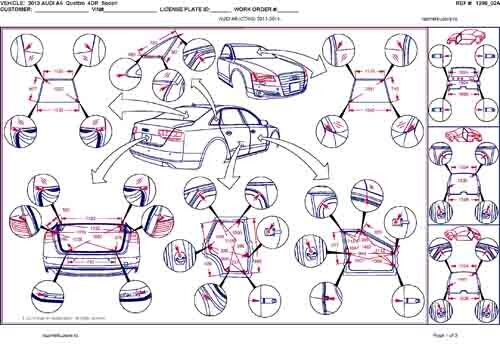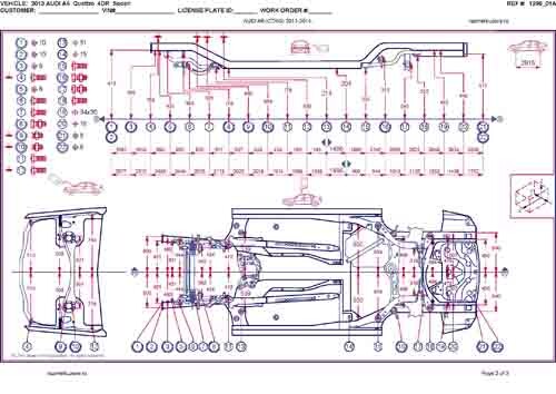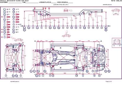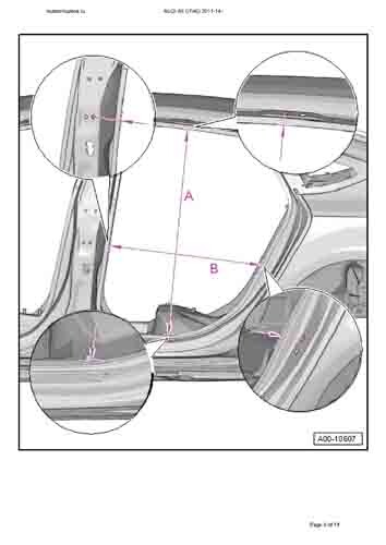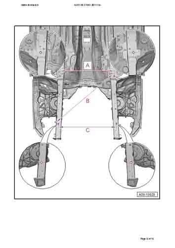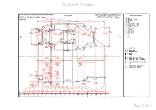 - Геометрические размеры кузова, как проекционные, так и непосредственного измерения, в том числе диагональные размеры проемов кузова и контрольные точки для восстановления геометрии кузова AUDI A6.