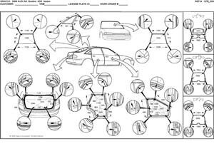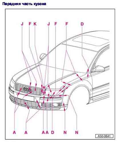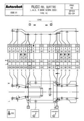 - Геометрические размеры кузова, как проекционные, так и непосредственного измерения, в том числе диагональные размеры проемов кузова и контрольные точки для восстановления геометрии кузова AUDI A8.