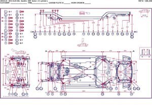 - Геометрические размеры кузова, как проекционные, так и непосредственного измерения, в том числе диагональные размеры проемов кузова и контрольные точки для восстановления геометрии кузова AUDI A8 (D4).