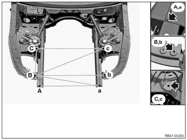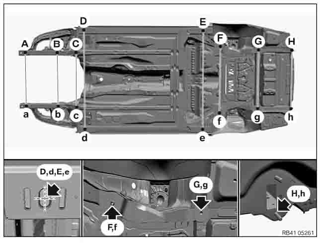 Контрольные кузовные размеры из официального руководства по ремонту кузова BMW 8 (G15) Coupe 2018-2022--. Дополнительно приведены величины зазоров кузовных панелей. Пояснения к чертежам автоматически переведены на русский язык.