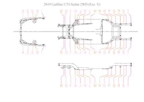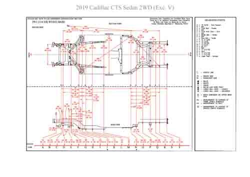 - Геометрические размеры кузова CADILLAC CTS 2013-2019, как проекционные, так и непосредственного измерения, в том числе диагональные размеры проемов кузова и контрольные точки для восстановления геометрии кузова.
