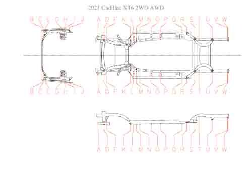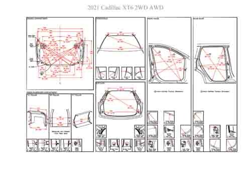 - Геометрические размеры кузова CADILLAC XT5 2016-2019--, как проекционные, так и непосредственного измерения, в том числе диагональные размеры проемов кузова и контрольные точки для восстановления геометрии кузова.