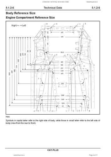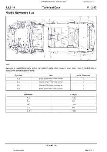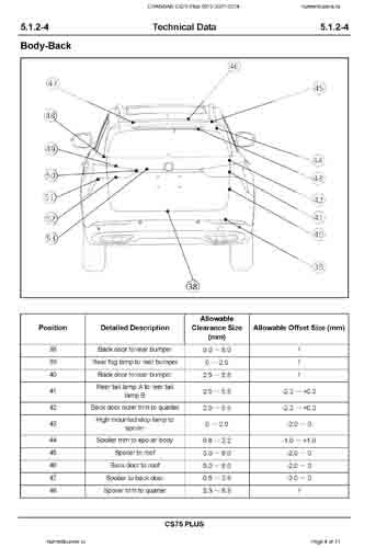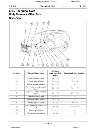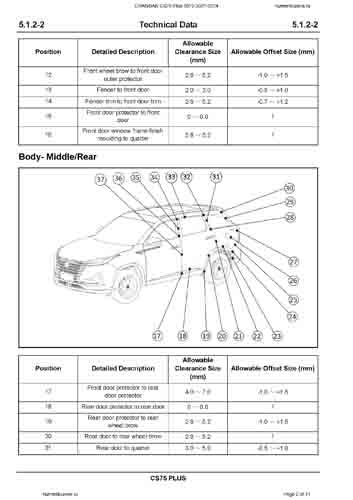 Контрольные размеры кузова для автомобилей CHANGAN CS75 Plus (S311) 2019-2021-2024 из заводского руководства по ремонту кузова, в том числе размеры проемов кузова. Дополнительно приведены сведения о допустимых зазорах кузовных панелей.