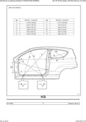 - Проекционные геометрические размеры кузова с привязкой к стапелю. Дополнительно приведены цветные фотографии мест расположения контрольных точек Chevrolet Aveo