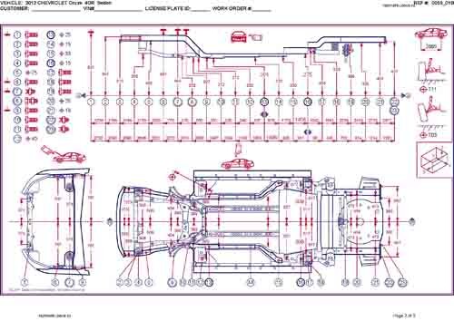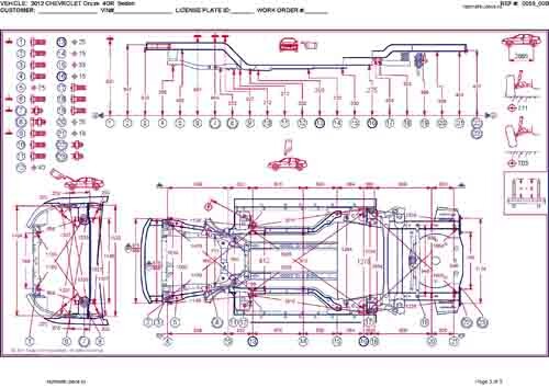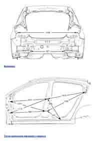 - Геометрические размеры кузова Chevrolet Cruze, как проекционные, так и непосредственного измерения, в том числе диагональные размеры проемов кузова и контрольные точки для восстановления геометрии кузова.
