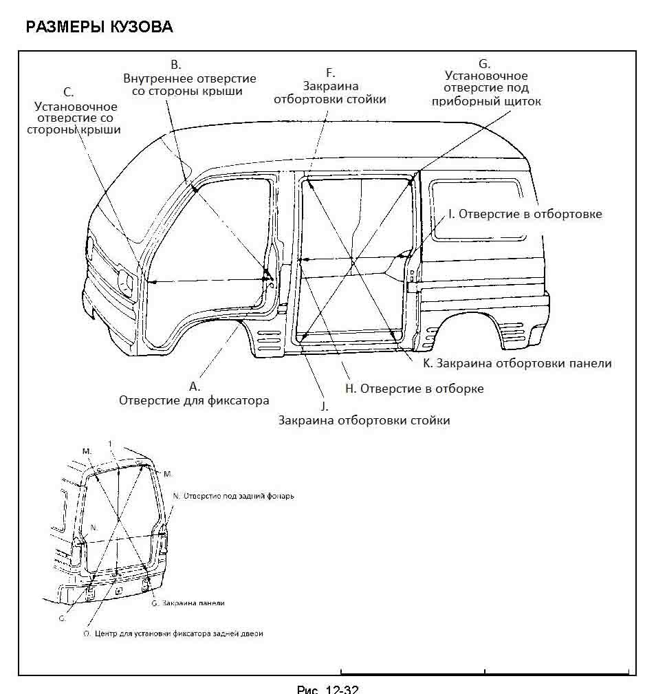 Контрольные кузовные размеры из официального руководства по ремонту кузова CHEVROLET Damas, Labo, в том числе диагональные размеры проемов кузова. Обратите внимание: информация довольно скудна. В галерее представлены ВСЕ имеющиеся чертежи.