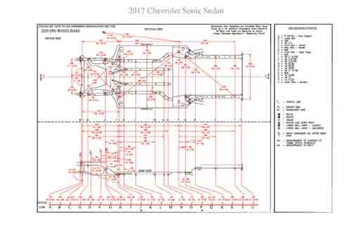 - Геометрические размеры кузова CHEVROLET Sonic 2011-2016-2020, как проекционные, так и непосредственного измерения, в том числе диагональные размеры проемов кузова и контрольные точки для восстановления геометрии кузова.