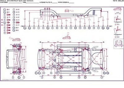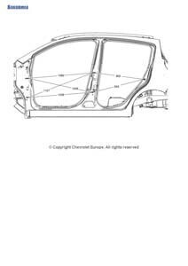 -Геометрические размеры CHEVROLET Spark, как проекционные, так и непосредственного измерения, в том числе диагональные размеры проемов кузова и контрольные точки для восстановления геометрии.