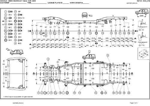 -Геометрические размеры CHEVROLET Tahoe, как проекционные, так и непосредственного измерения, в том числе диагональные размеры проемов кузова и контрольные точки для восстановления геометрии.