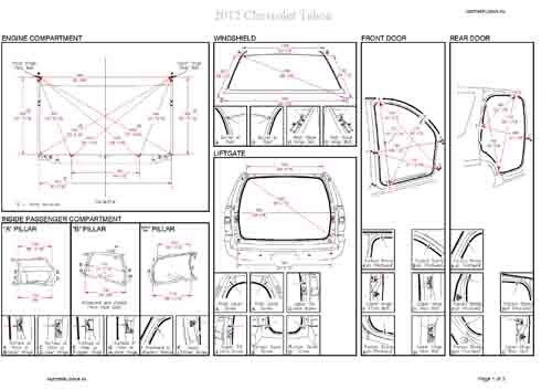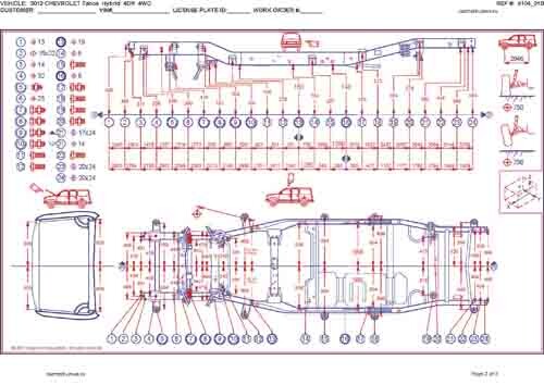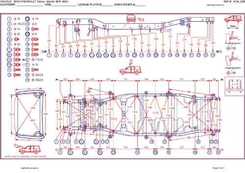 - Геометрические размеры кузова CHEVROLET Tahoe 2006-2014, как проекционные, так и непосредственного измерения, в том числе диагональные размеры проемов кузова и контрольные точки для восстановления геометрии кузова.