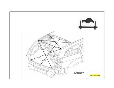 - Проекционные геометрические размеры кузова с привязкой к стапелю. Дополнительно приведены цветные фотографии мест расположения контрольных точек на реальном автомобиле.