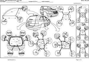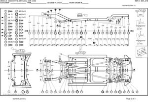 -Геометрические размеры, как проекционные, так и непосредственного измерения, в том числе диагональные размеры проемов кузова и контрольные точки для восстановления геометрии.