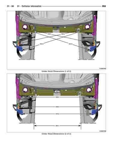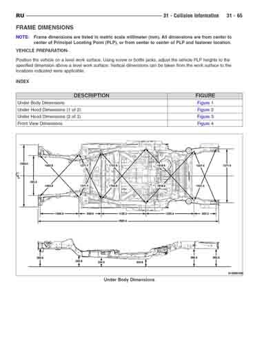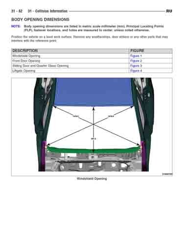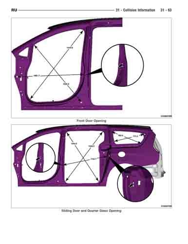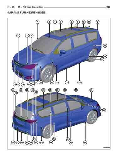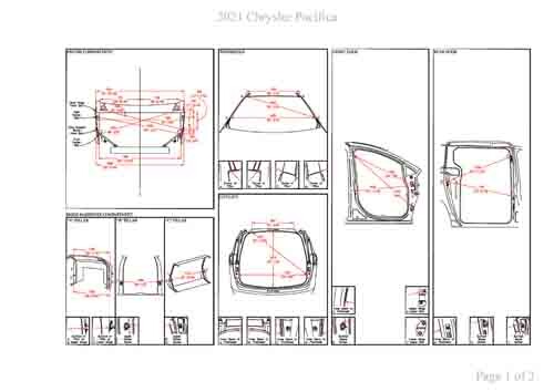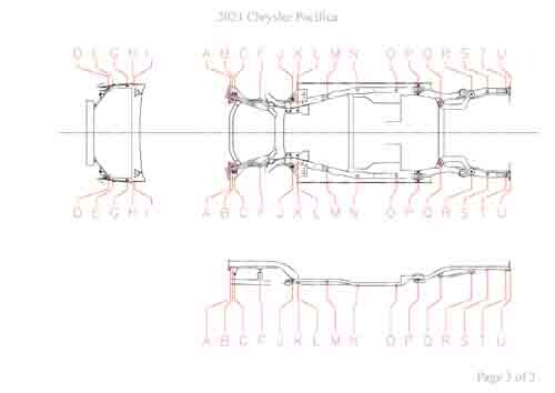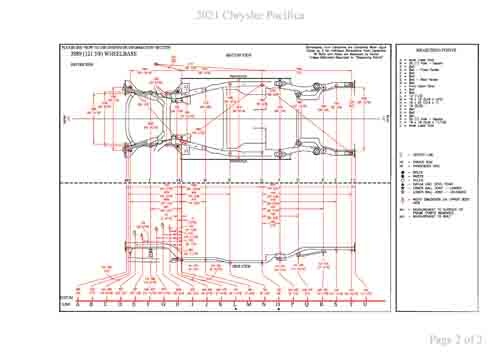 - Геометрические размеры кузова CHRYSLER Pacifica (RU) 2017--, как проекционные, так и непосредственного измерения, в том числе диагональные размеры проемов кузова и контрольные точки для восстановления геометрии кузова.