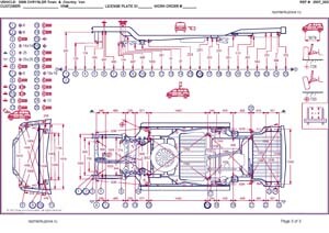-Геометрические размеры, как проекционные, так и непосредственного измерения, в том числе диагональные размеры проемов кузова и контрольные точки для восстановления геометрии.