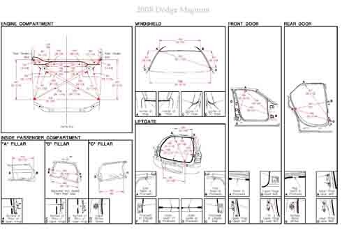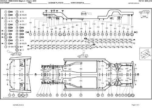 - Геометрические размеры кузова DODGE Magnum (LX) 2003-2008, как проекционные, так и непосредственного измерения, в том числе диагональные размеры проемов кузова и контрольные точки для восстановления геометрии кузова.