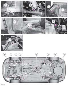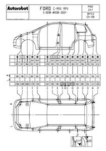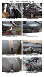 - Проекционные геометрические размеры кузова с привязкой к стапелю. Дополнительно приведены цветные фотографии мест расположения контрольных точек FORD C-MAX на реальном автомобиле.