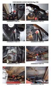 - Проекционные геометрические размеры кузова с привязкой к стапелю. Дополнительно приведены цветные фотографии мест расположения контрольных точек FORD Mondeo на реальном автомобиле.