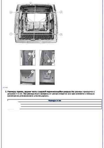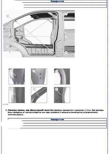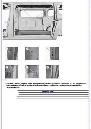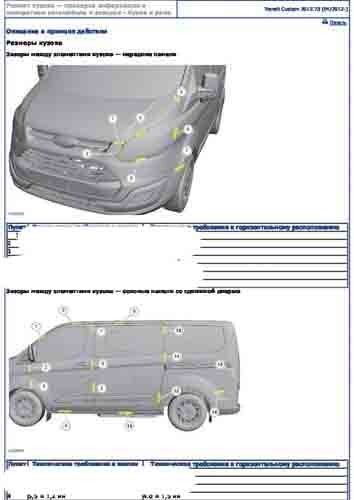 Контрольные кузовные размеры из заводского руководства по ремонту кузова FORD Transit Custom 2012-2023, в том числе размеры проемов. Дополнительно приведены величины допустимых зазоров кузовных панелей. Обратите внимание на миниатюры - изготовитель предоставил не очень полные данные по размерам.