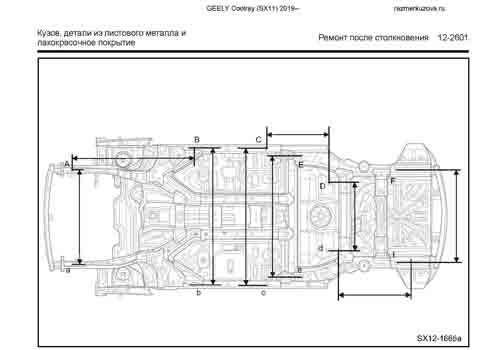 Контрольные размеры кузова для автомобилей GEELY Coolray (SX11) 2019-2024-- из заводского руководства по ремонту кузова, в том числе размеры проемов кузова.