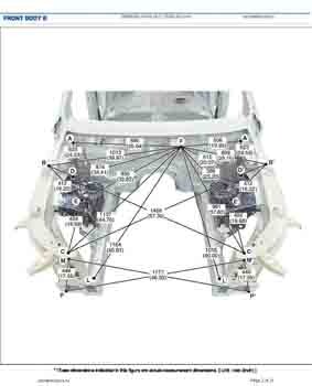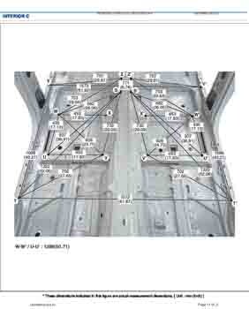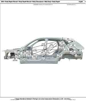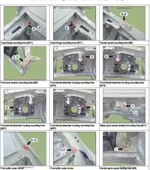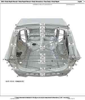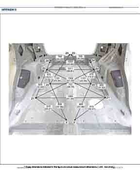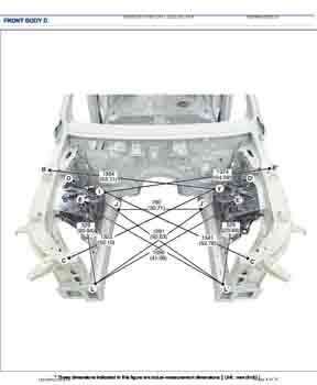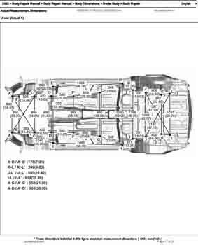 Контрольные размеры кузова для автомобилей GENESIS GV80 (JX1) 2020-2023-н.в. из заводского руководства по ремонту кузова, в том числе размеры проемов кузова. Дополнительно приведены сведения о допустимых зазорах кузовных панелей.