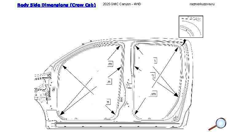 Контрольные кузовные размеры из официального руководства по ремонту кузова GMC Canyon 2022--, в том числе диагональные размеры проемов кузова. Обратите внимание: информация довольно скудна. В галерее представлены ВСЕ имеющиеся чертежи.