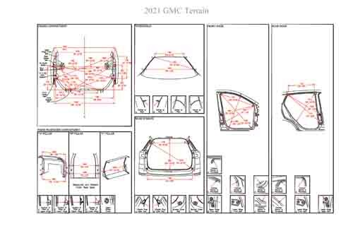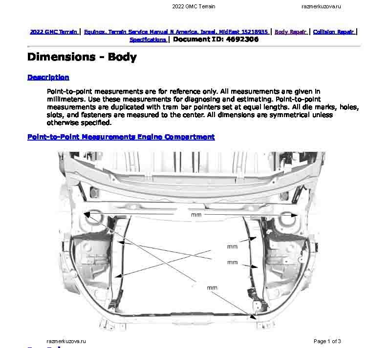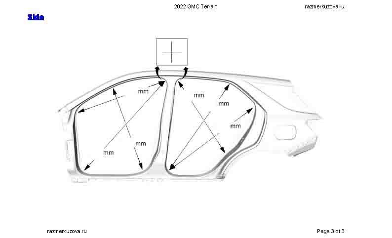 - Геометрические размеры кузова GMC Terrain 2017-2024, как проекционные, так и непосредственного измерения, в том числе диагональные размеры проемов кузова и контрольные точки для восстановления геометрии кузова.