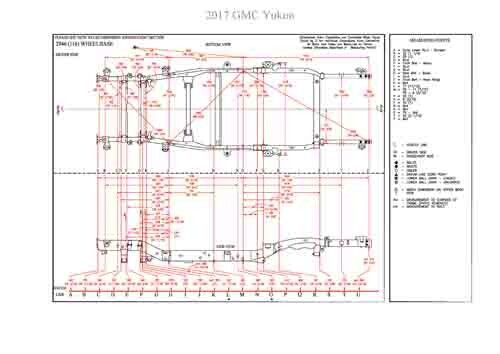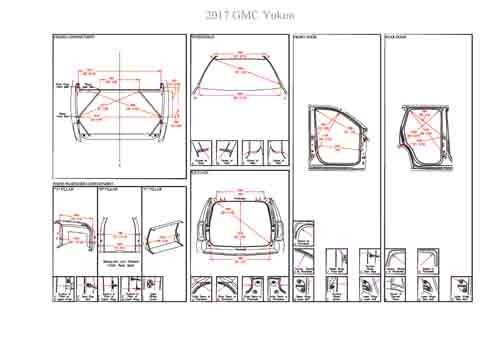 - Геометрические размеры кузова GMC Yukon (GMTK2UG) 2014-2020, как проекционные, так и непосредственного измерения, в том числе диагональные размеры проемов кузова и контрольные точки для восстановления геометрии кузова.