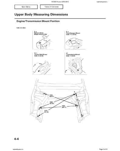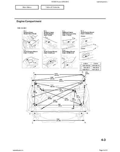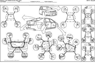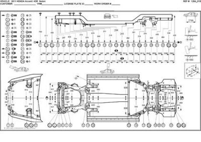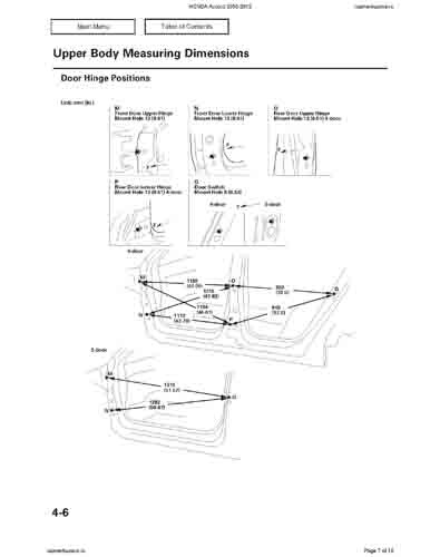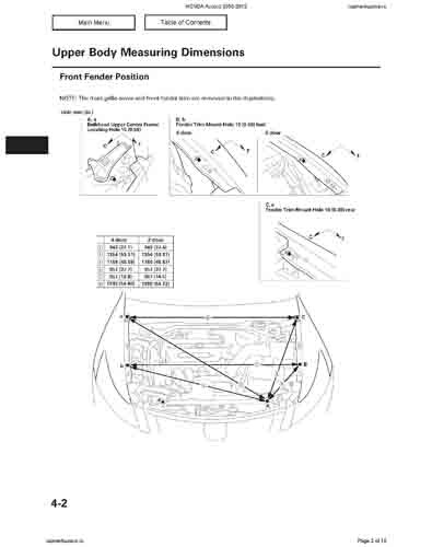 из официального руководства по ремонту кузова. Содержат размеры верхней и нижней части кузова, в том числе размеры моторного отсека, диагональные размеры проемов кузова, размеры подрамников и контрольные точки для восстановления геометрии кузова. Даны значения допустимых зазоров кузовных панелей.