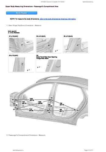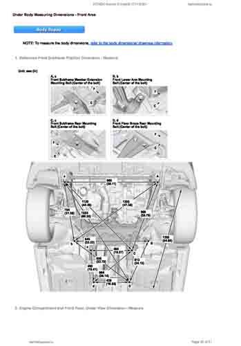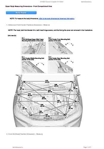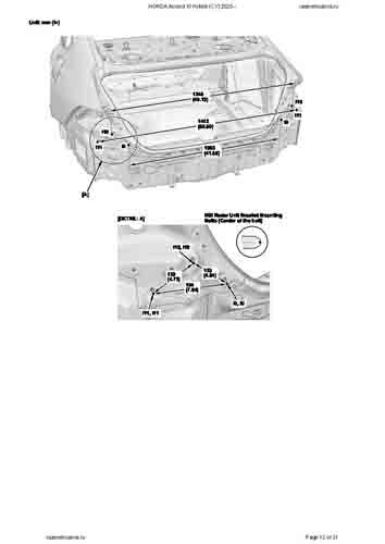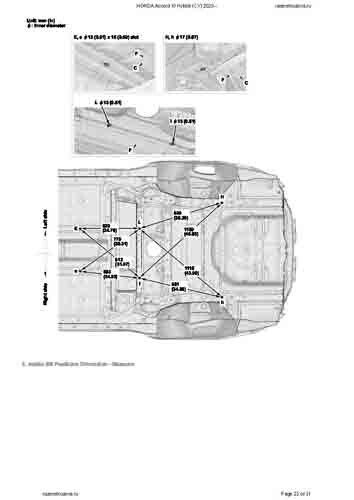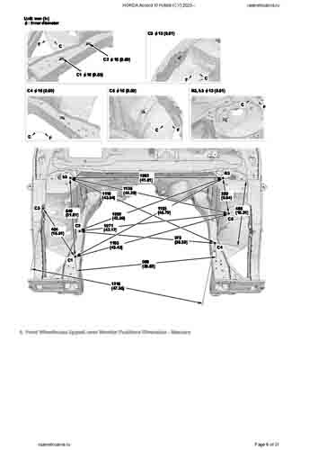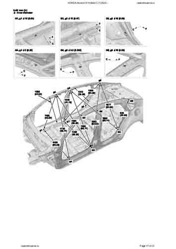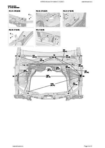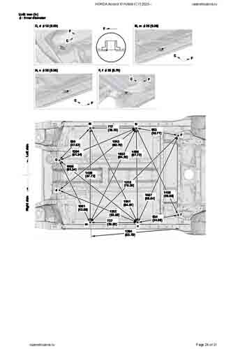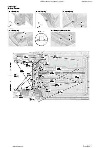 Контрольные кузовные размеры HONDA Accord XI Hybrid (CY) 2023-- из официального руководства по ремонту кузова. Содержат размеры верхней и нижней части кузова, в том числе размеры моторного отсека, диагональные размеры проемов кузова, размеры подрамников и контрольные точки для восстановления геометрии кузова. Даны значения допустимых зазоров кузовных панелей.