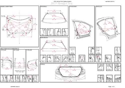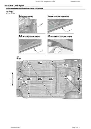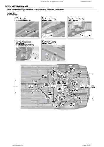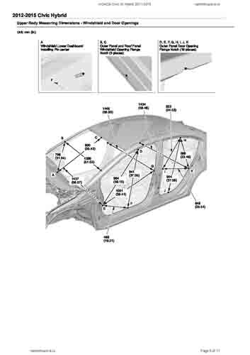- Геометрические размеры кузова HONDA Civic IX Hybrid 2011-2015, как проекционные, так и непосредственного измерения, в том числе диагональные размеры проемов кузова и контрольные точки для восстановления геометрии кузова.