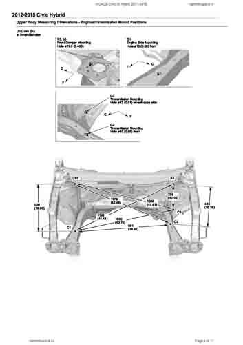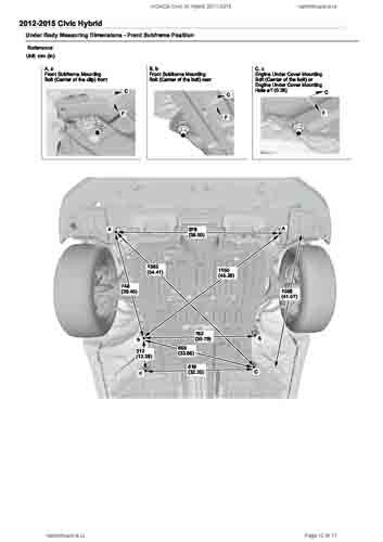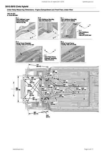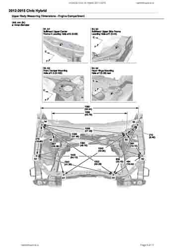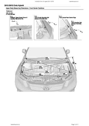 Контрольные кузовные размеры HONDA Civic IX Hybrid 2011-2015 из официального руководства по ремонту кузова. Содержат размеры верхней и нижней части кузова, в том числе размеры моторного отсека, диагональные размеры проемов кузова, размеры подрамников и контрольные точки для восстановления геометрии кузова. Даны значения допустимых зазоров кузовных панелей.