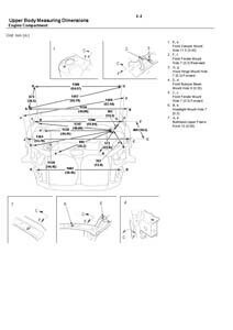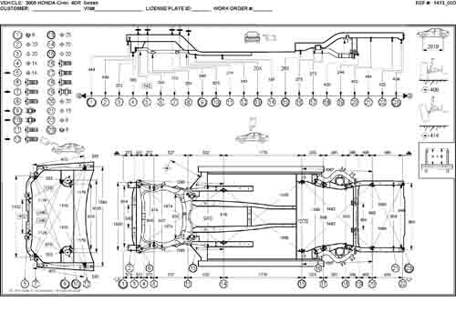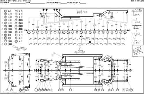 - Геометрические размеры кузова Honda Civic Sedan, как проекционные, так и непосредственного измерения, в том числе диагональные размеры проемов кузова и контрольные точки для восстановления геометрии кузова.