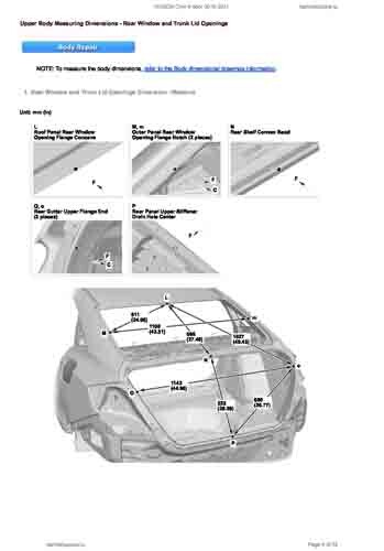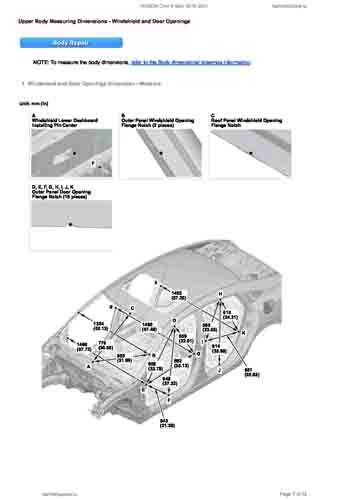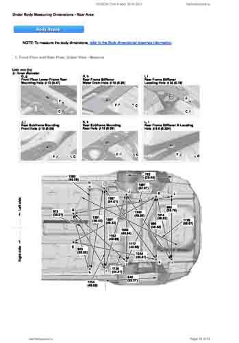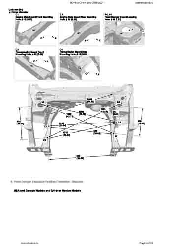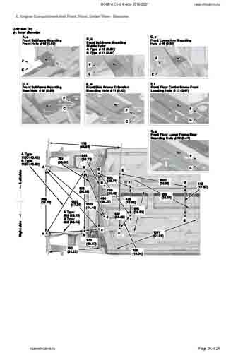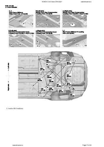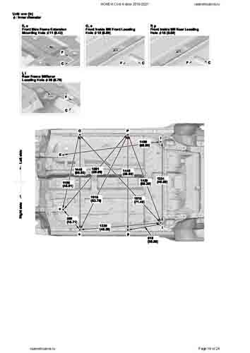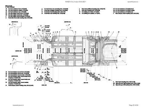 - Геометрические размеры кузова HONDA Civic X 2015-2021, как проекционные, так и непосредственного измерения, в том числе диагональные размеры проемов кузова и контрольные точки для восстановления геометрии кузова.