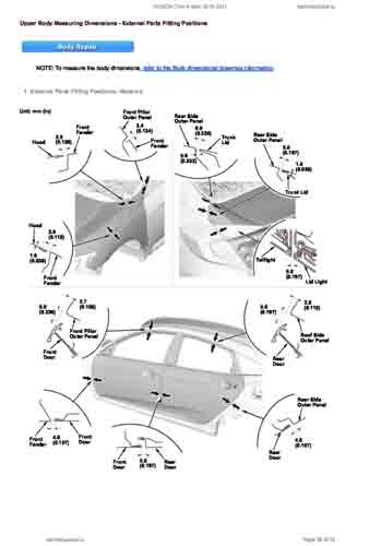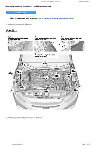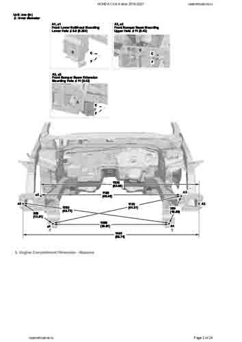 Контрольные кузовные размеры HONDA Civic X 2015-2021 из официального руководства по ремонту кузова. Содержат размеры верхней и нижней части кузова, в том числе размеры моторного отсека, диагональные размеры проемов кузова, размеры подрамников и контрольные точки для восстановления геометрии кузова. Даны значения допустимых зазоров кузовных панелей.
