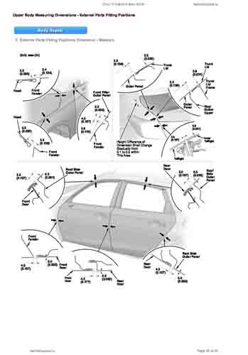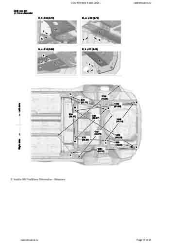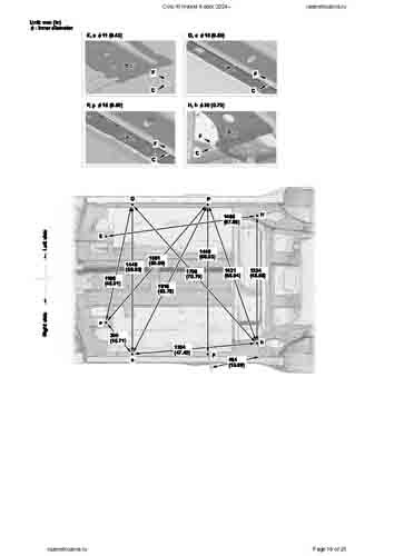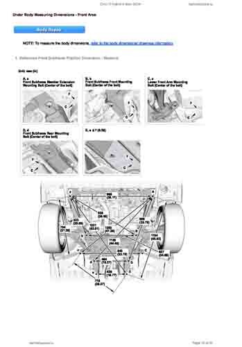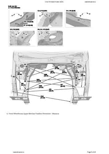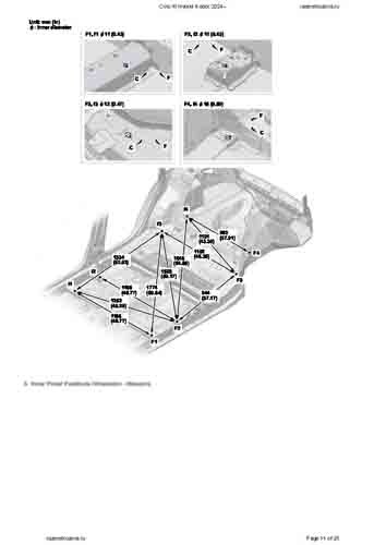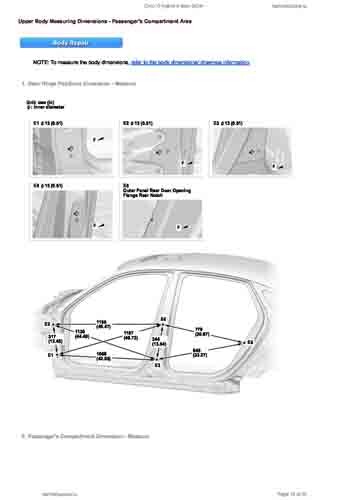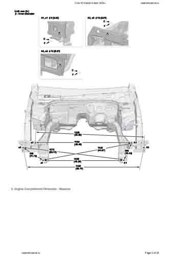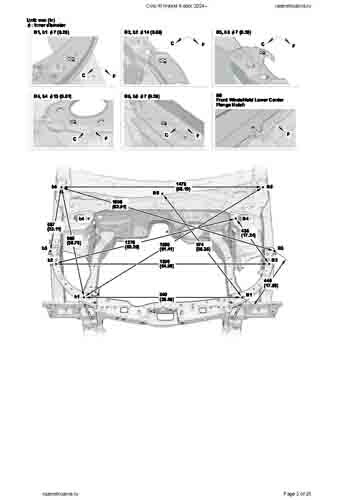 Контрольные кузовные размеры HONDA Civic XI Hybrid 2024-- из официального руководства по ремонту кузова. Содержат размеры верхней и нижней части кузова, в том числе размеры моторного отсека, диагональные размеры проемов кузова, размеры подрамников и контрольные точки для восстановления геометрии кузова. Даны значения допустимых зазоров кузовных панелей.