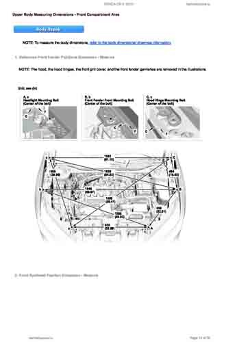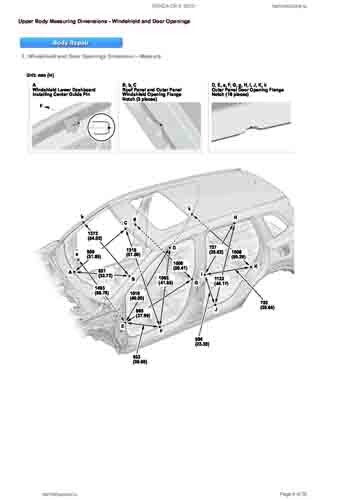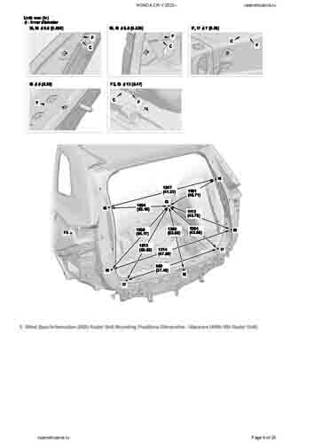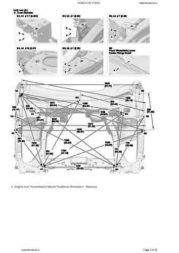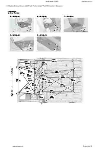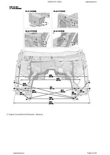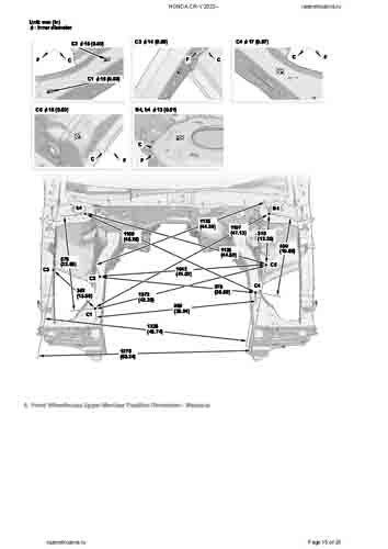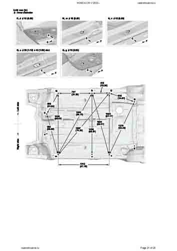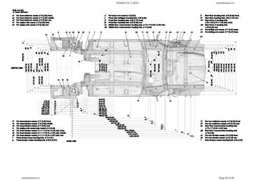 Контрольные кузовные размеры HONDA CR-V 2023--из официального руководства по ремонту кузова. Содержат размеры верхней и нижней части кузова, в том числе размеры моторного отсека, диагональные размеры проемов кузова, размеры подрамников и контрольные точки для восстановления геометрии кузова. Даны значения допустимых зазоров кузовных панелей.